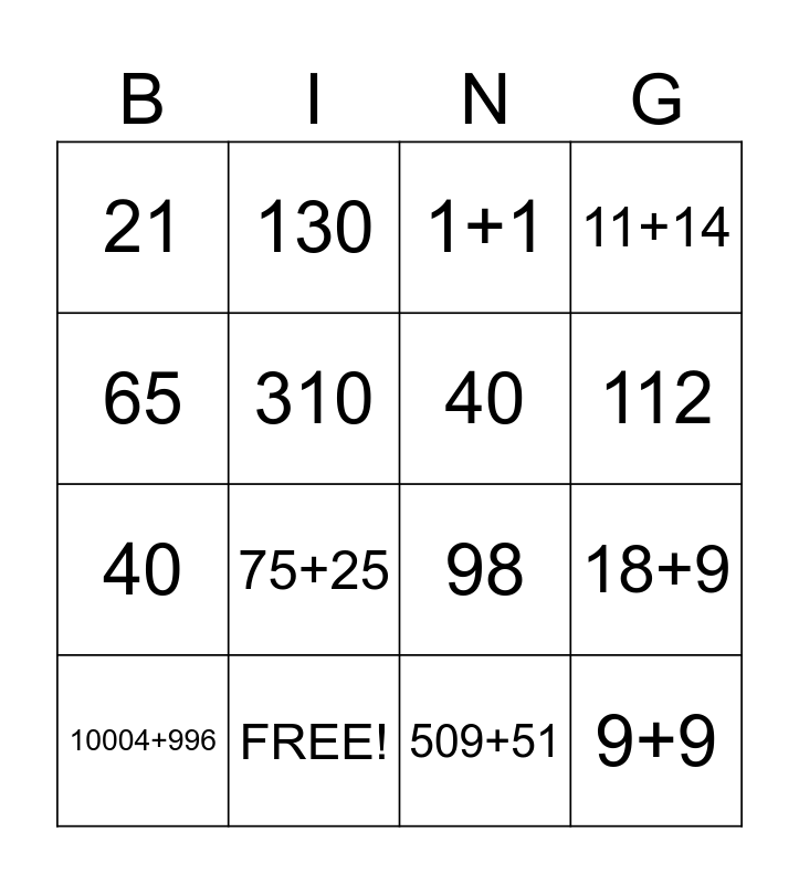This bingo card has 25 words: 110, 98, 112, 29, 65, 21, 310, 130, FREE!, 90, 40, 98, 71, 33, 40, 51, 509+51, 1+1, 75+25, 18+9, 10004+996, 12+12, 9+9, 11+14 and 78+3.