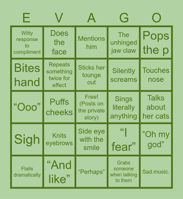 This bingo card has a free space and 24 words: Knits eyebrows, “And like”, Sticks her tounge out, Flails dramatically, Pops the p, Witty response to compliment, Bites hand, Does the face, Sings literally anything, Side eye with the smile, Silently screams, “Ooo”, “I fear”, “Oh my god”, Repeats something twice for effect, Grabs someone when talking to them, Talks about her cats, Mentions him, Touches nose, Puffs cheeks, Sad.music., Sigh, The unhinged jaw claw and “Perhaps”.