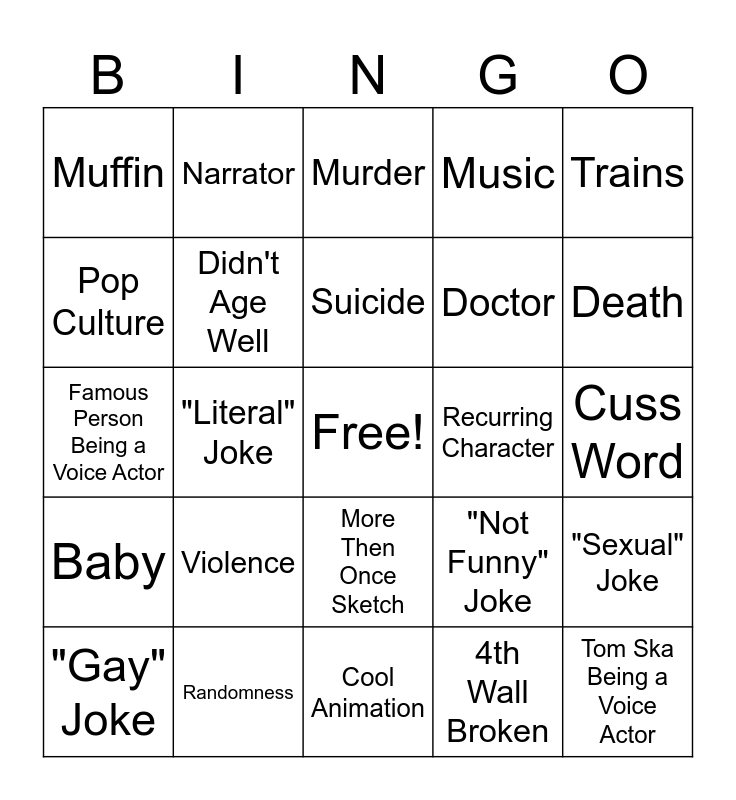 This bingo card has a free space and 24 words: Violence, Randomness, Suicide, "Gay" Joke, Trains, Muffin, Pop Culture, Narrator, Recurring Character, More Then Once Sketch, Doctor, Famous Person Being a Voice Actor, "Not Funny" Joke, "Sexual" Joke, Didn't Age Well, 4th Wall Broken, Cuss Word, Murder, Death, "Literal" Joke, Tom Ska Being a Voice Actor, Baby, Music and Cool Animation.