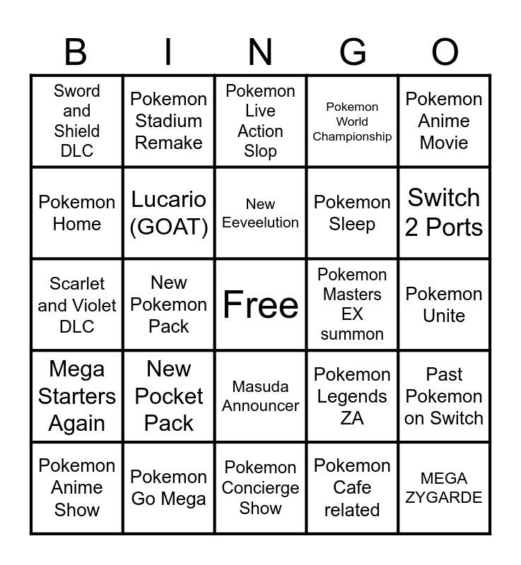 This bingo card has a free space and 24 words: New Pocket Pack, Pokemon Go Mega, New Eeveelution, Pokemon Anime Show, Pokemon Anime Movie, Sword and Shield DLC, Pokemon Home, Pokemon Stadium Remake, Pokemon Masters EX summon, Masuda Announcer, Pokemon Sleep, Scarlet and Violet DLC, Pokemon Legends ZA, Past Pokemon on Switch, Lucario (GOAT), Pokemon Cafe related, Pokemon Unite, Pokemon Live Action Slop, Switch 2 Ports, New Pokemon Pack, MEGA ZYGARDE, Mega Starters Again, Pokemon World Championship and Pokemon Concierge Show.