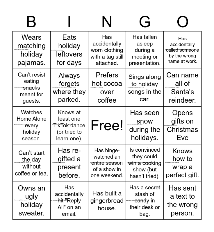 This bingo card has 21 images, a free space and 24 words: Has re-gifted a present before., Has accidentally hit "Reply All" on an email., Prefers hot cocoa over coffee, Owns an ugly holiday sweater., Has accidentally called someone by the wrong name at work., Wears matching holiday pajamas., Can’t resist eating snacks meant for guests., Eats holiday leftovers for days, Has seen snow during the holidays., Has binge-watched an entire season of a show in one weekend., Sings along to holiday songs in the car., Watches Home Alone every holiday season., Is convinced they could win a cooking show (but hasn’t tried)., Knows how to wrap a perfect gift., Always forgets where they parked., Has a secret stash of candy in their desk or bag., Opens gifts on Christmas Eve, Has accidentally worn clothing with a tag still attached., Can name all of Santa's reindeer., Knows at least one TikTok dance (or tried to learn one)., Has sent a text to the wrong person., Can’t start the day without coffee or tea., Has fallen asleep during a meeting or presentation. and Has built a gingerbread house..