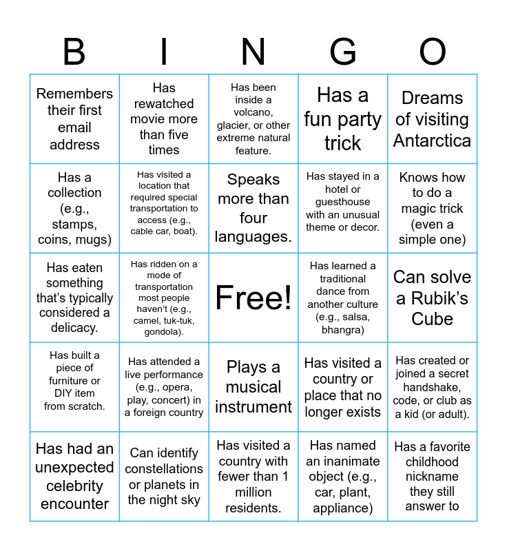 This bingo card has a free space and 35 words: Has stayed overnight in a unique accommodation (e.g., igloo, houseboat, treehouse)., Has tried an extreme sport (e.g., scuba diving, skydiving)., Has eaten something bizarre or adventurous (e.g., insects, unusual seafood), Has visited a location that required special transportation to access (e.g., cable car, boat)., Plays a musical instrument, Has a fun party trick, Has a collection (e.g., stamps, coins, mugs), Has a lucky charm they keep nearby, Speaks more than four languages., Has lived in more than three countries., Has eaten something that’s typically considered a delicacy., Dreams of visiting Antarctica, Has learned a skill that’s completely unrelated to their profession, Has a favorite childhood toy they still own, Remembers their first email address, Has learned a traditional dance from another culture (e.g., salsa, bhangra), Has named an inanimate object (e.g., car, plant, appliance), Has ridden on a mode of transportation most people haven’t (e.g., camel, tuk-tuk, gondola)., Has built a piece of furniture or DIY item from scratch., Has a favorite childhood nickname they still answer to, Has visited a country or place that no longer exists, Has had an unexpected celebrity encounter, Has created or joined a secret handshake, code, or club as a kid (or adult)., Can identify constellations or planets in the night sky, Has been inside a volcano, glacier, or other extreme natural feature., Knows how to do a magic trick (even a simple one), Has crossed the equator during their travels., Has participated in a themed run or walk (e.g., Color Run, Zombie Run)., Has stayed in a hotel or guesthouse with an unusual theme or decor., Can solve a Rubik’s Cube, Knows how to write their name in more than three different alphabets or scripts., Has visited a country with fewer than 1 million residents., Has attended a live performance (e.g., opera, play, concert) in a foreign country, Has rewatched movie more than five times and Has a favorite mug or cup they always use and can explain why..