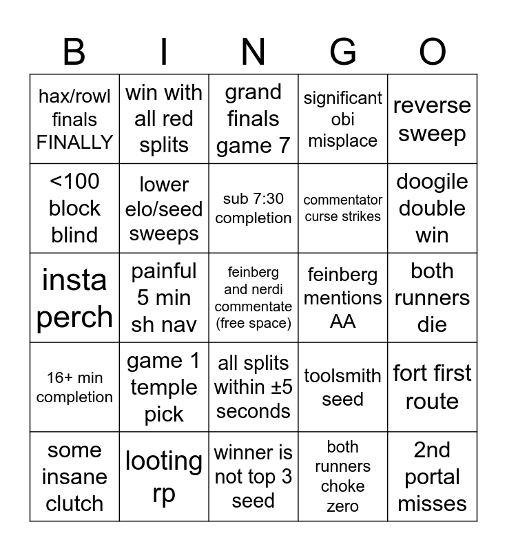 This bingo card has a free space and 24 words: some insane clutch, game 1 temple pick, sub 7:30 completion, both runners choke zero, reverse sweep, hax/rowl finals FINALLY, win with all red splits, grand finals game 7, feinberg mentions AA, both runners die, insta perch, lower elo/seed sweeps, toolsmith seed, fort first route, <100 block blind, looting rp, winner is not top 3 seed, significant obi misplace, doogile double win, 16+ min completion, painful 5 min sh nav, all splits within ±5 seconds, commentator curse strikes and 2nd portal misses.