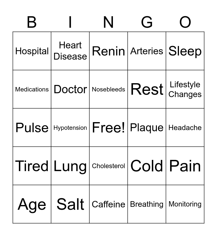 This bingo card has a free space and 24 words: Lung, Salt, Nosebleeds, Age, Sleep, Hospital, Medications, Heart Disease, Plaque, Cholesterol, Rest, Pulse, Cold, Pain, Doctor, Breathing, Headache, Renin, Lifestyle Changes, Hypotension, Monitoring, Tired, Arteries and Caffeine.