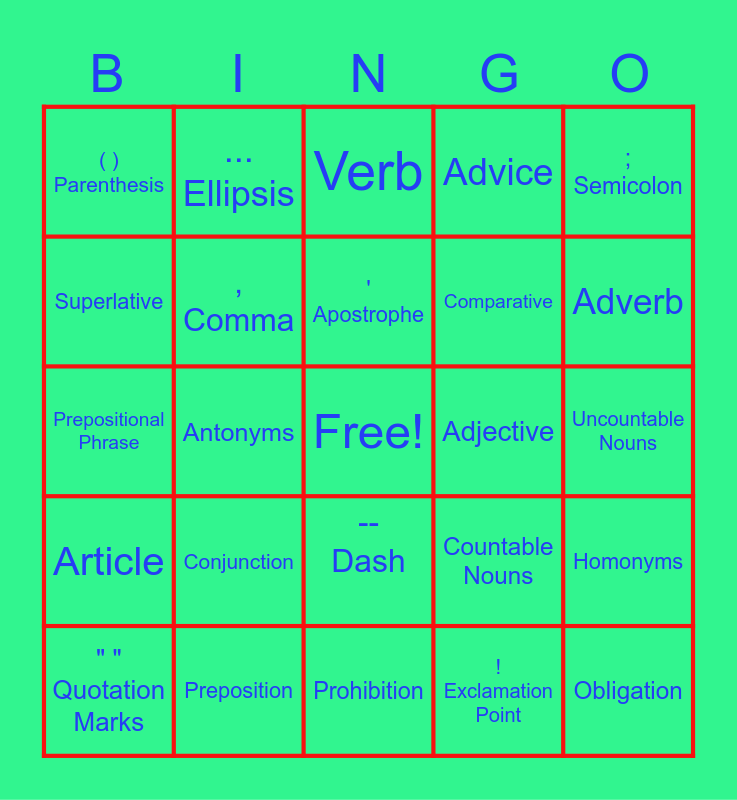 This bingo card has a free space and 34 words: ? Question Mark, ! Exclamation Point, : Colon, . Period, Article, , Comma, ; Semicolon, " " Quotation Marks, ... Ellipsis, / Slash, ' Apostrophe, Verb, Noun, Pronoun, Adjective, Adverb, Preposition, Prepositional Phrase, Conjunction, Countable Nouns, -- Dash, - Hyphen, ( ) Parenthesis, Uncountable Nouns, Prohibition, Obligation, Advice, Permission, Comparative, Superlative, Synonyms, Antonyms, Homonyms and Idioms.