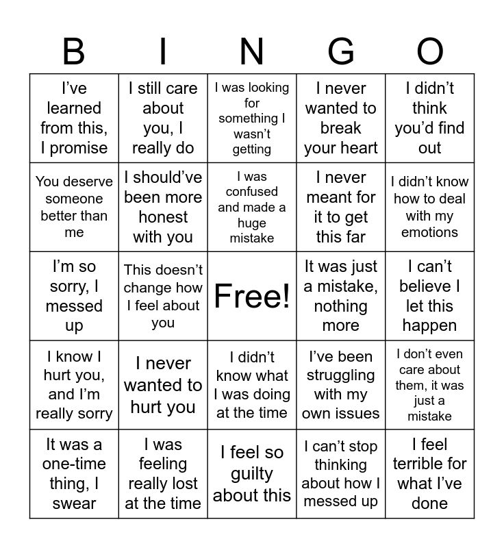 This bingo card has a free space and 25 words: I never wanted to hurt you, I feel so guilty about this, I was confused and made a huge mistake, It was a one-time thing, I swear, I didn’t think you’d find out, I’ve learned from this, I promise, You deserve someone better than me, I still care about you, I really do, It was just a mistake, nothing more, I didn’t know what I was doing at the time, I never meant for it to get this far, I’m so sorry, I messed up, I’ve been struggling with my own issues, I don’t even care about them, it was just a mistake, I should’ve been more honest with you, You were distant too, though, I can’t believe I let this happen, I was looking for something I wasn’t getting, I didn’t know how to deal with my emotions, This doesn’t change how I feel about you, I feel terrible for what I’ve done, I was feeling really lost at the time, I know I hurt you, and I’m really sorry, I never wanted to break your heart and I can’t stop thinking about how I messed up.