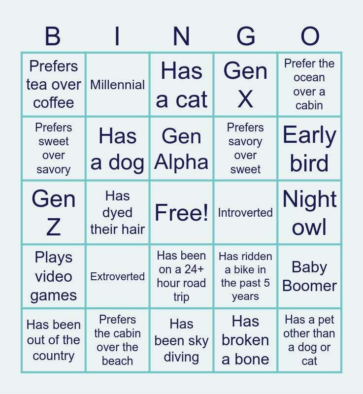 This bingo card has a free space and 29 words: Has been out of the country, Has a tattoo, Has dyed their hair, Has lived in another state, Prefers tea over coffee, Has a cat, Has a dog, Extroverted, Introverted, Prefers the cabin over the beach, Night owl, Has a pet other than a dog or cat, Has been sky diving, Has broken a bone, Early bird, knows how to change a tire, Has been on a 24+ hour road trip, Plays video games, Prefer the ocean over a cabin, Gen Z, Has ridden a bike in the past 5 years, Has been on television, Prefers savory over sweet, Prefers sweet over savory, Gen X, Millennial, Baby Boomer, Gen Alpha and Would rather be snacking than playing this game.