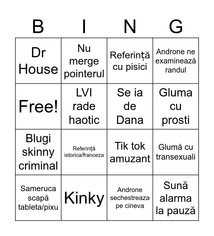 This bingo card has 16 words: Kinky, Glumă cu transexuali, Referință cu pisici, Dr House, Blugi skinny criminal, Nu merge pointerul, Tik tok amuzant, Androne sechestreaza pe cineva, Free!, LVI rade haotic, Sameruca scapă tableta/pixu, Androne ne examinează randul, Referință istorica/franceza, Gluma cu prosti, Se ia de Dana and Sună alarma la pauză.