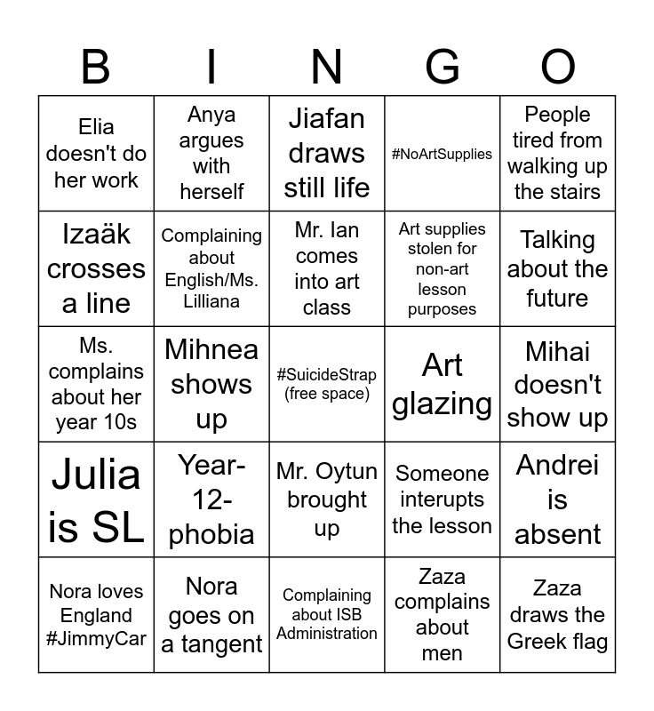This bingo card has a free space and 26 words: Mr. Oytun brought up, Zaza complains about men, Mr. Ian comes into art class, Nora goes on a tangent, People tired from walking up the stairs, Elia doesn't do her work, Izaäk crosses a line, Anya argues with herself, Mihai doesn't show up, Someone interupts the lesson, Art supplies stolen for non-art lesson purposes, Ms. complains about her year 10s, Andrei is absent, Nora loves England #JimmyCar, Mihnea shows up, #SofieHasGreatAsthetic, #NoArtSupplies, Julia is SL, Jiafan draws still life, Zaza draws the Greek flag, Talking about the future, Complaining about ISB Administration, Art glazing, Year-12-phobia, Complaining about English/Ms. Lilliana and Cleaning up after another class.