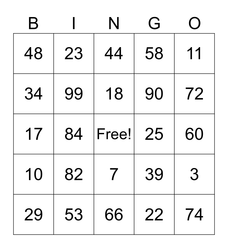 This bingo card has a free space and 24 words: 82, 53, 18, 29, 11, 48, 34, 23, 25, 7, 90, 17, 39, 3, 99, 22, 60, 44, 72, 84, 74, 10, 58 and 66.