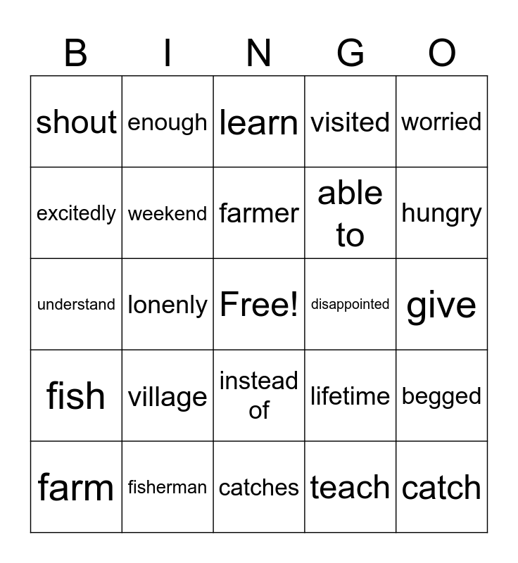 This bingo card has a free space and 24 words: village, fisherman, farmer, farm, worried, shout, excitedly, enough, disappointed, instead of, able to, understand, lifetime, begged, weekend, teach, give, learn, hungry, lonenly, catch, fish, visited and catches.