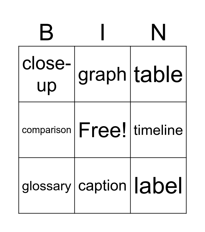 This bingo card has a free space and 19 words: highlighted text, photograph, table, italics, bolded print, label, hyperlink, close-up, graph, index, icon, timeline, glossary, map, bullets, diagram, comparison, caption and table of contents.