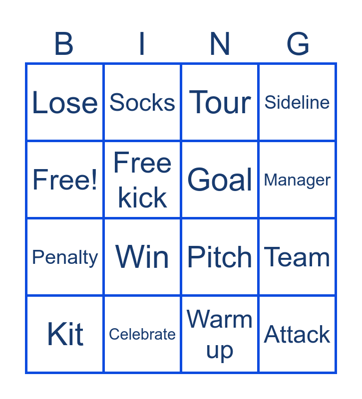 This bingo card has 36 words: Ball, Striker, Coach, Goal, Defence, Attack, Manager, Ref, Free!, Changing rooms, Team, Sideline, Keeper, Celebrate, Win, Lose, Score, Boots, Kit, Tour, Warm up, Whistle, Red card, Sin-bin, Shin -pads, Socks, Pitch, Kick-off, Penalty, Free kick, Throw-in, Stretch, Half Time, Press, Club and Supporters.