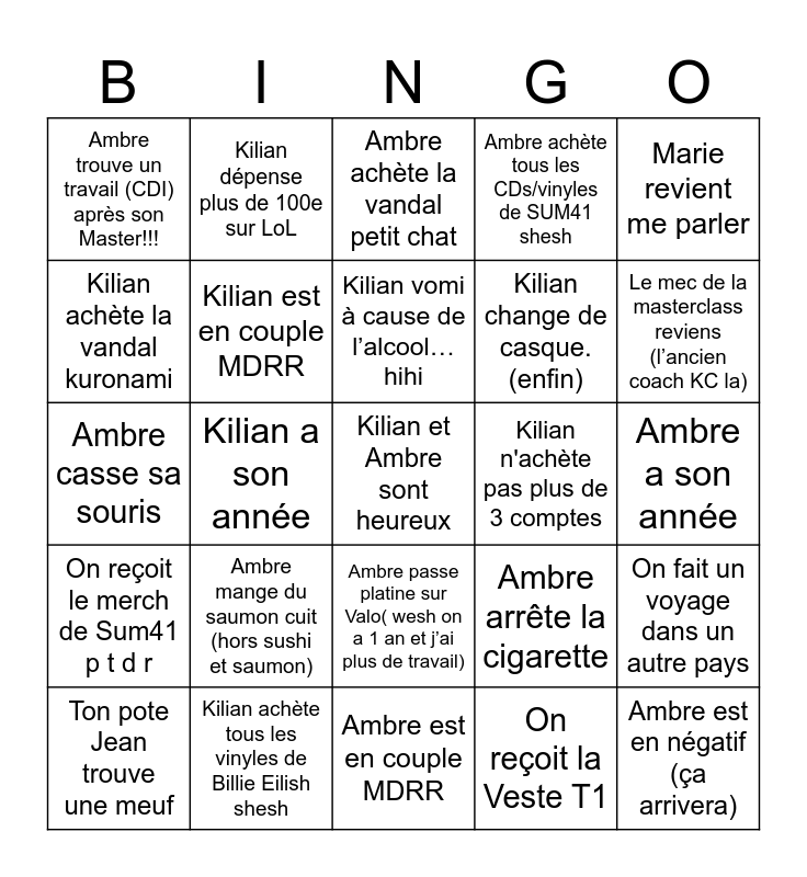 This bingo card has a free space and 24 words: Ambre mange du saumon cuit (hors sushi et saumon), Kilian achète tous les vinyles de Billie Eilish shesh, Kilian vomi à cause de l’alcool… hihi, Ton pote Jean trouve une meuf, Marie revient me parler, Ambre trouve un travail (CDI) après son Master!!!, Kilian achète la vandal kuronami, Kilian dépense plus de 100e sur LoL, Kilian n'achète pas plus de 3 comptes, Ambre passe platine sur Valo( wesh on a 1 an et j’ai plus de travail), Kilian change de casque. (enfin), Ambre casse sa souris, Ambre arrête la cigarette, On fait un voyage dans un autre pays, Kilian est en couple MDRR, On reçoit la Veste T1, Ambre a son année, Ambre achète la vandal petit chat, Le mec de la masterclass reviens (l’ancien coach KC la), Kilian a son année, Ambre est en négatif (ça arrivera), On reçoit le merch de Sum41 p t d r, Ambre achète tous les CDs/vinyles de SUM41 shesh and Ambre est en couple MDRR.