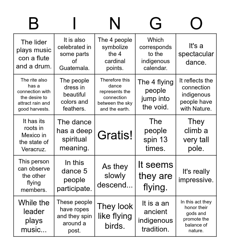 This bingo card has a free space and 24 words: In this dance 5 people participate., These people have ropes and they spin around a post., Therefore this dance represents the connection between the sky and the earth., While the leader plays music..., It's a spectacular dance., The lider plays music con a flute and a drum., The rite also has a connection with the desire to attract rain and good harvests., It is also celebrated in some parts of Guatemala., The people spin 13 times., As they slowly descend..., The 4 flying people jump into the void., It has its roots in Mexico in the state of Veracruz., It seems they are flying., It's really impressive., The people dress in beautiful colors and feathers., It is a an ancient indigenous tradition., They climb a very tall pole., The 4 people symbolize the 4 cardinal points., It reflects the connection indigenous people have with Nature., The dance has a deep spiritual meaning., In this act they honor their gods and promote the balance of nature., This person can observe the other flying members., Which corresponds to the indigenous calendar. and They look like flying birds..