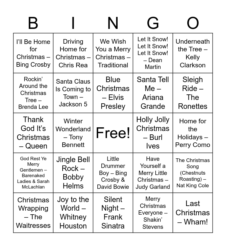This bingo card has a free space and 50 words: All I Want for Christmas Is You – Mariah Carey, Last Christmas – Wham!, White Christmas – Bing Crosby, Silent Night – Frank Sinatra, Jingle Bell Rock – Bobby Helms, Feliz Navidad – José Feliciano, Driving Home for Christmas – Chris Rea, Do They Know It’s Christmas? – Band Aid, Rockin’ Around the Christmas Tree – Brenda Lee, It’s the Most Wonderful Time of the Year – Andy Williams, Santa Claus Is Coming to Town – Jackson 5, Let It Snow! Let It Snow! Let It Snow! – Dean Martin, The Christmas Song (Chestnuts Roasting) – Nat King Cole, Have Yourself a Merry Little Christmas – Judy Garland, Wonderful Christmastime – Paul McCartney, Happy Xmas (War Is Over) – John Lennon & Yoko Ono, Blue Christmas – Elvis Presley, Holly Jolly Christmas – Burl Ives, Baby, It’s Cold Outside – Dean Martin & Martina McBride, Underneath the Tree – Kelly Clarkson, Winter Wonderland – Tony Bennett, Merry Christmas Everyone – Shakin’ Stevens, I’ll Be Home for Christmas – Bing Crosby, Santa Tell Me – Ariana Grande, Christmas (Baby Please Come Home) – Darlene Love, It’s Beginning to Look a Lot Like Christmas – Michael Bublé, Sleigh Ride – The Ronettes, O Holy Night – Celine Dion, We Wish You a Merry Christmas – Traditional, Little Drummer Boy – Bing Crosby & David Bowie, Rudolph the Red-Nosed Reindeer – Gene Autry, Step into Christmas – Elton John, Carol of the Bells – Pentatonix, Hark! The Herald Angels Sing – Nat King Cole, Joy to the World – Whitney Houston, Deck the Halls – Mannheim Steamroller, Angels We Have Heard on High – Josh Groban, Silver Bells – Perry Como, Run Rudolph Run – Chuck Berry, Home for the Holidays – Perry Como, O Come, All Ye Faithful – Andrea Bocelli, Ave Maria – Luciano Pavarotti, Christmas in Hollis – Run-D.M.C., Peace on Earth/Little Drummer Boy – Bing Crosby & David Bowie, Christmas Wrapping – The Waitresses, Thank God It’s Christmas – Queen, Candlelight Carol – John Rutter, Fairytale of New York – The Pogues ft. Kirsty MacColl, God Rest Ye Merry Gentlemen – Barenaked Ladies & Sarah McLachlan and Mary’s Boy Child – Boney M.