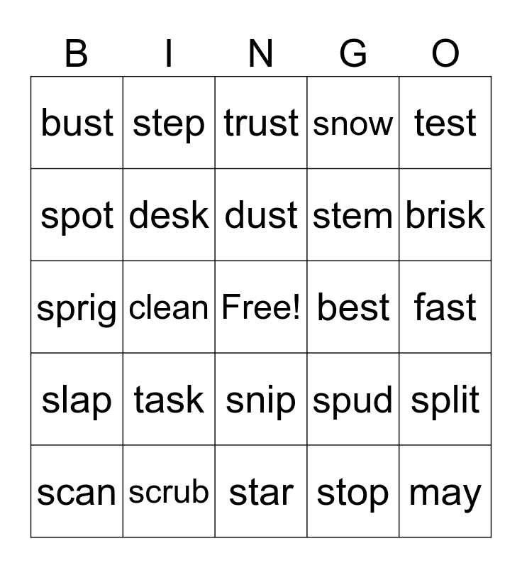This bingo card has a free space and 24 words: task, scrub, dust, scan, test, bust, spot, step, best, snip, stem, sprig, spud, split, desk, stop, fast, trust, brisk, clean, may, slap, snow and star.