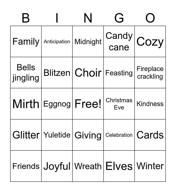 This bingo card has a free space and 46 words: Wishes, Winter, Wonderland, Wreath, Yuletide, Advent, Anticipation, Baking, Bells jingling, Blessed, Blitzen, Candy cane, Cards, Celebration, Chestnuts, Chill, Choir, Christmas Eve, Christmas lights, Cozy, Eggnog, Elves, Family, Feasting, Festive, Fireplace crackling, Friends, Gathering, Giving, Glitter, Happiness, Ho Ho Ho, Holiday cheer, Icicles glistening, Ice skating, Joyful, Kindness, Laughter, Love shared, Marshmallows, Merry, Midnight, Mirth, Noel singing, Nutmeg and Pajamas.