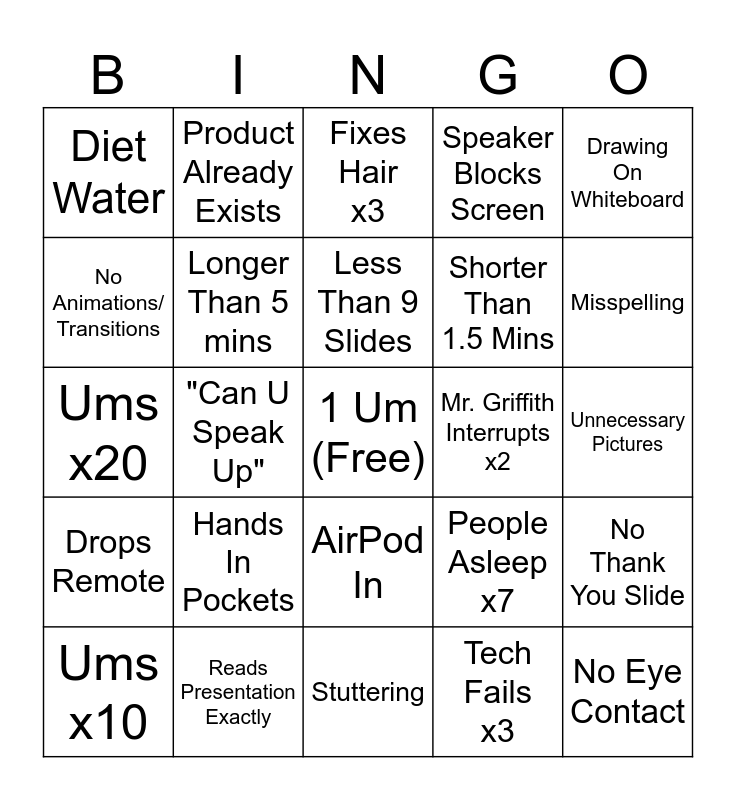 This bingo card has a free space and 29 words: Ums x10, 1 Cough, "Can U Speak Up", Stalling, Diet Water, Fixes Hair x3, Longer Than 5 mins, Hands In Pockets, Mr. Griffith Interrupts x2, Reads Presentation Exactly, Unnecessary Pictures, No Eye Contact, Stuttering, Tech Fails x3, Misspelling, Completely Lost, AirPod In, Drops Remote, Drawing On Whiteboard, Ums x20, People Asleep x7, No Pictures, Shorter Than 1.5 Mins, No Animations/ Transitions, Speaker Blocks Screen, Product Already Exists, No Thank You Slide, Less Than 9 Slides and More Than 9 Slides.