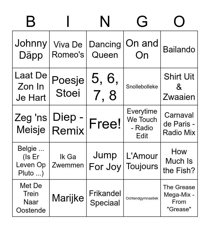 This bingo card has a free space and 107 words: Europapa, Bitterballen Enne Meter Bier, Diep - Remix, The Ketchup Song (Aserejé) - Spanglish Version, Langzaufen, Wild Dances, Captain Jack - Short Mix, Engelbewaarder, Sweet Caroline, Laat Het Gras Maar Groeien - Dorothee Vegas & Like Maarten Remix, Links Rechts, Skinnydippen, Something, Lift U Up, Potentie, Walk on Water - H2O Radio Mix, Viva De Romeo's, Atje Voor De Sfeer - Remix, Turbulentie (Omhoog Omlaag), De Marie Louise, Ik Ga Zwemmen, The Tide Is High - Radio Mix, De Vloer Is Lava, Leeuw - Remix, Knalgele Speedo, Bailando, Laat De Zon In Je Hart, On and On, Engeltje, Zeil Je Voor Het Eerst, Engelengezang, Marijke, Ik Spring Uit Een Vliegmachien, Freak Out - 97 Remix, Ymca, Dancing Queen, Boom, Boom, Boom, Boom!!, Turbo, Everybody (Backstreet's Back) - Radio Edit, The Grease Mega-Mix - From "Grease", Helemaal Koekoek, Allez Allez, Frikandel Speciaal, Bella ciao, Atemlos durch die Nacht, Poesje Stoei, ABC, 5, 6, 7, 8, Vol Met Alcohol, Everytime We Touch - Radio Edit, Alle Kleuren, Shirt Uit & Zwaaien, Belgie ... (Is Er Leven Op Pluto ...), 1001 Arabian Nights, I Will Survive - Remastered, Schotse Kilt, Ik Heb Een Toeter Op M'n Waterscooter, De kleine krokodil, Alles is op, Johnny Däpp, Gangnam Style (강남스타일), We’re Going to Ibiza!, Leef, Barbie Girl, Thunderstruck, Wellerman - Sea Shanty / 220 KID x Billen Ted Remix, Allemaal, How Much Is the Fish?, Pief Poef Paf, L'Amour Toujours, Jump For Joy, Zeg 'ns Meisje, Ochtendgymnastiek, Helemaal Koekoek - Goal Tune, Mooi Weer Vandaag, Enamorada - Remix, Lekker Blijven Hangen - Thierry von der Warth Remix, Tarzan & Jane, Pump It Up - Radio Edit, We Kunnen Het Feestje Aan, Hey Baby (Uhh, Ahh), Boten Anna, I Save The Day, Que Si, Que No - Sunclub Radio Mix, Ik Moet Zuipen!, Oh Mandy - Radio Edit, Ik Ben Een Vent !, Helikopter, De Hoeken Van De Kamer, Zeil Je Voor Het Eerst - Remix, Snollebolleke, De vriendschapsband, Jodelkampioen, Dromen Zijn Bedrog, Viva De Romeo's - Remix, Oya Lélé, Met De Trein Naar Oostende, Dos Cervezas, Europapa (DJ Paul Elstak Remix), Ooh Aah...Just a Little Bit - Motiv8 Radio Edit, It's OK, All Right, Een Kopje Koffie, Celebration - Single Version, Like a Prayer, Believe, Carnaval de Paris - Radio Mix and Daddy DJ - Chico & Tonio Radio Edit.
