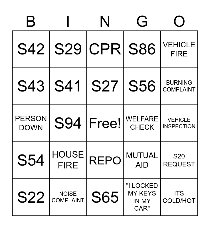 This bingo card has a free space and 29 words: S22, S41/4, S94, S3, S42, CPR, S41, HOUSE FIRE, WELFARE CHECK, NOISE COMPLAINT, VEHICLE INSPECTION, ITS COLD/HOT, S65, "I LOCKED MY KEYS IN MY CAR", BURNING COMPLAINT, S24, REPO, S54, VEHICLE FIRE, PERSON DOWN, MUTUAL AID, HOSPITAL DIVERSION, S56, S43, S86, S29, S20 REQUEST, S27 and LIFT ASSIST.