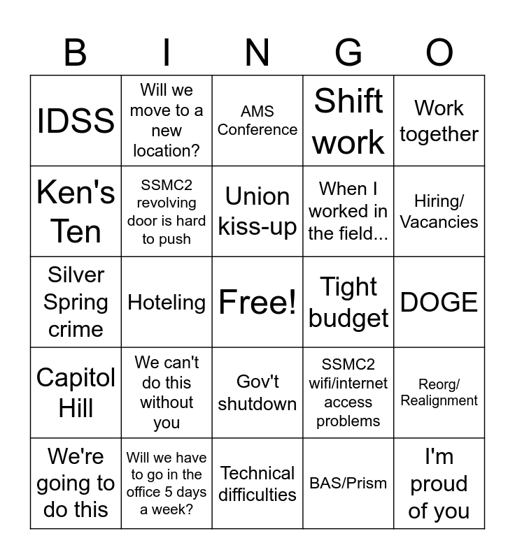This bingo card has a free space and 24 words: We can't do this without you, Will we have to go in the office 5 days a week?, Union kiss-up, We're going to do this, Work together, IDSS, Ken's Ten, Will we move to a new location?, Tight budget, Gov't shutdown, When I worked in the field..., Silver Spring crime, SSMC2 wifi/internet access problems, Reorg/ Realignment, SSMC2 revolving door is hard to push, BAS/Prism, DOGE, AMS Conference, Hiring/ Vacancies, Hoteling, I'm proud of you, Capitol Hill, Shift work and Technical difficulties.