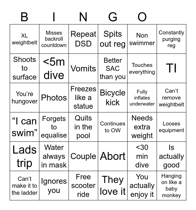 This bingo card has 36 words: Abort, Couple, They love it, Shoots to surface, “I can swim”, Bicycle kick, <5m dive, Free scooter ride, Non swimmer, <30 min dive, TI, Spits out reg, Is actually good, Photos, Better SAC than you, XL weightbelt, Lads trip, Fully inflates underwater, You’re hungover, Repeat DSD, Freezes like a statue, Forgets to equalise, Continues to OW, Quits in the pool, Needs extra weight, Misses backroll countdown, Touches everything, Ignores you, Vomits, Constantly purging reg, Hanging on like a baby monkey, Can’t make it to the ladder, Looses equipment, Can’t remove weightbelt, Water always in mask and You actually enjoy it.