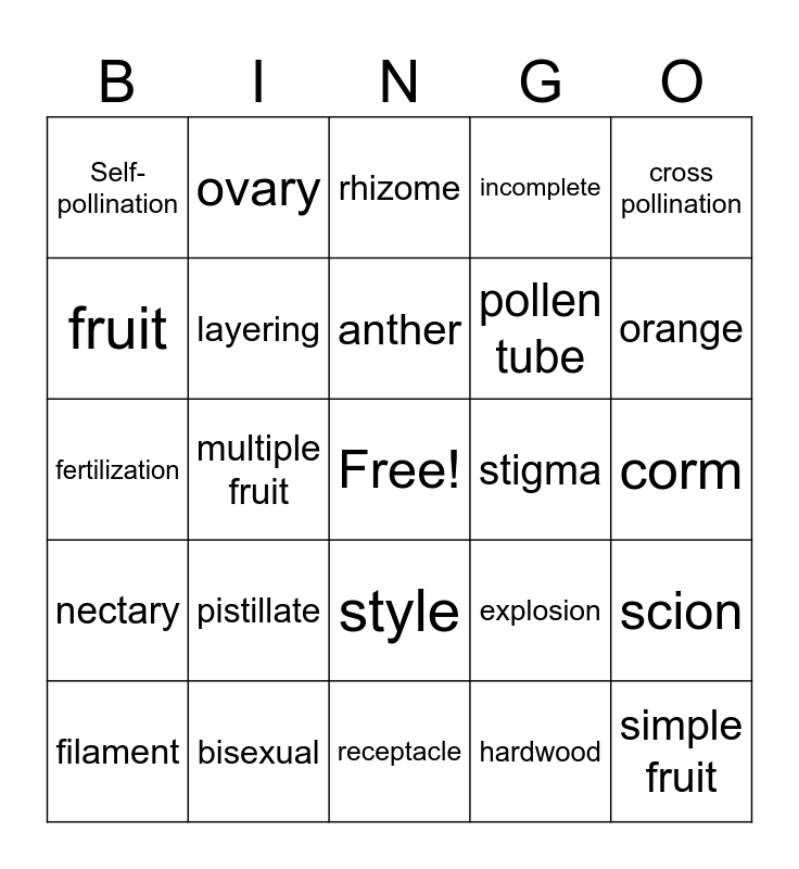 This bingo card has a free space and 24 words: pistillate, bisexual, anther, filament, cross pollination, Self-pollination, fruit, ovary, stigma, style, pollen tube, fertilization, explosion, scion, layering, hardwood, corm, rhizome, orange, multiple fruit, simple fruit, nectary, incomplete and receptacle.