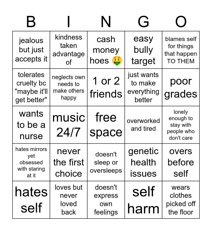 This bingo card has a free space and 24 words: never the first choice, loves but never loved back, 1 or 2 friends, hates self, blames self for things that happen TO THEM, jealous but just accepts it, tolerates cruelty bc "maybe it'll get better", kindness taken advantage of, overworked and tired, doesn't sleep or oversleeps, just wants to make everything better, wants to be a nurse, genetic health issues, overs before self, neglects own needs to make others happy, self harm, lonely enough to stay with people who don't care, cash money hoes 🤑, poor grades, music 24/7, wears clothes picked off the floor, hates mirrors yet obsessed with staring at it, easy bully target and doesn't express own feelings.