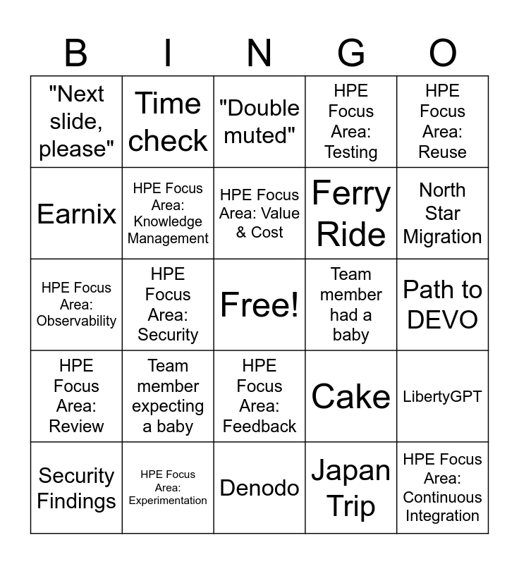 This bingo card has a free space and 40 words: HPE Focus Area: Tech Debt, HPE Focus Area: Observability, "Drain the slide", HPE Focus Area: Knowledge Management, HPE Focus Area: Experimentation, HPE Focus Area: Feedback, HPE Focus Area: Value & Cost, HPE Focus Area: Autonomy with Alignment, HPE Focus Area: Reuse, HPE Focus Area: Review, HPE Focus Area: Security, HPE Focus Area: Testing, HPE Focus Area: Continuous Integration, Path to DEVO, Team member had a baby, Team member expecting a baby, Kelly's Retirement, "Next slide, please", "Couldn't find the mute button", "Double muted", LibertyGPT, Japan Trip, Ferry Ride, Earnix, Mainframe, Oracle, Seattle Trip, Retirement, ACORD file, Dynamic IDMC Pipeline, BLCC Upgrade, Security Findings, Santa's elves, Cake, North Star Migration, Denodo, "Can you see my screen?", "You are muted.", Time check and Winning with purpose together..