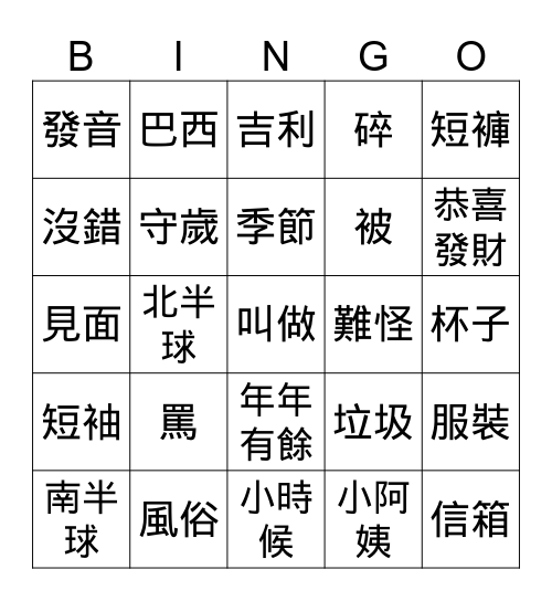This bingo card has 34 words: 信箱, 小阿姨, 戴, 帽子, 短袖, 守歲, 短褲, 南半球, 巴西, 南非, 季節, 吉利, 不管, 相反, 難怪, 恭喜發財, 風俗, 見面, 罵, 垃圾, 年年有餘, 歲歲平安, 發音, 杯子, 小時候, 叫做, 碎, 倒, 被, 沒錯, 上衣, 北半球, 服裝 and 地區.