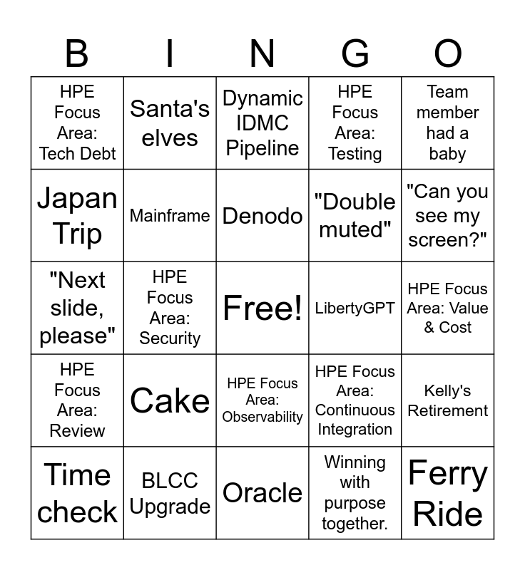 This bingo card has a free space and 40 words: HPE Focus Area: Feedback, "Next slide, please", HPE Focus Area: Reuse, Mainframe, BLCC Upgrade, HPE Focus Area: Observability, Denodo, Team member expecting a baby, Team member had a baby, HPE Focus Area: Review, HPE Focus Area: Security, HPE Focus Area: Testing, Ferry Ride, HPE Focus Area: Value & Cost, LibertyGPT, Cake, Security Findings, HPE Focus Area: Tech Debt, Earnix, Dynamic IDMC Pipeline, Kelly's Retirement, Winning with purpose together., "Double muted", Japan Trip, North Star Migration, Seattle Trip, HPE Focus Area: Knowledge Management, "Drain the slide", "You are muted.", HPE Focus Area: Experimentation, HPE Focus Area: Autonomy with Alignment, Time check, Retirement, HPE Focus Area: Continuous Integration, "Can you see my screen?", Oracle, ACORD file, Path to DEVO, Santa's elves and "Couldn't find the mute button".