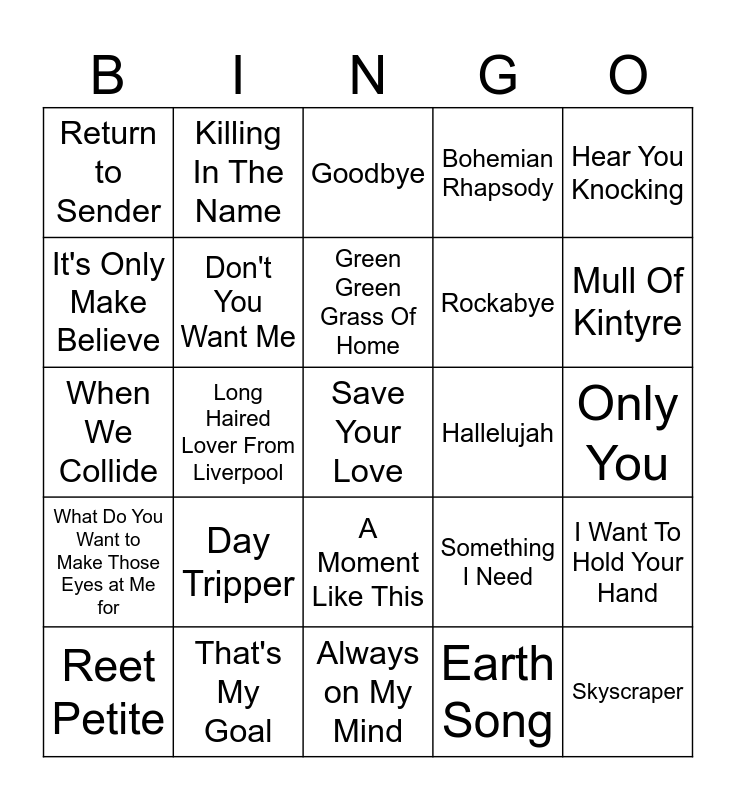 This bingo card has 37 words: Free!, Just Walkin' in the Rain, Another Brick In The Wall, Don't You Want Me, I Want To Hold Your Hand, Day Tripper, Green Green Grass Of Home, Lily the Pink 9 Two Little Boys, Hear You Knocking, Ernie (The Fastest Milkman in the West), Long Haired Lover From Liverpool, Bohemian Rhapsody, Save Your Love, Only You, It's Only Make Believe, What Do You Want to Make Those Eyes at Me for, 2 Become 1, Goodbye, A Moment Like This, Hallelujah, Return to Sender, Mull Of Kintyre, Reet Petite, Always on My Mind, I Will Always Love You, Earth Song, Killing In The Name, Have a Dream, Somethin' Stupid, Sound Of The Underground, Mad World, That's My Goal, When We Collide, Skyscraper, Something I Need, Rockabye and Perfect.