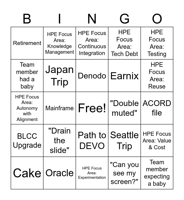 This bingo card has a free space and 40 words: HPE Focus Area: Security, HPE Focus Area: Autonomy with Alignment, Kelly's Retirement, Japan Trip, Oracle, Path to DEVO, Denodo, North Star Migration, HPE Focus Area: Testing, BLCC Upgrade, Mainframe, HPE Focus Area: Tech Debt, Team member expecting a baby, ACORD file, "Double muted", "Drain the slide", "You are muted.", Retirement, HPE Focus Area: Observability, HPE Focus Area: Continuous Integration, HPE Focus Area: Value & Cost, "Can you see my screen?", Earnix, Team member had a baby, HPE Focus Area: Review, "Next slide, please", LibertyGPT, Dynamic IDMC Pipeline, Time check, HPE Focus Area: Feedback, Winning with purpose together., Cake, Ferry Ride, Seattle Trip, HPE Focus Area: Reuse, HPE Focus Area: Experimentation, Security Findings, "Couldn't find the mute button", HPE Focus Area: Knowledge Management and Santa's elves.