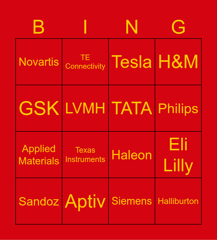 This bingo card has 198 words: Free!, 3M, ABB, Abbott Laboratories, adidas, Airbus Group, Alibaba, Amazon, Apple, Applied Materials, Aptiv, ASML, Asos, Atlas Copco, Baker Hughes, Bayer, Becton Dickinson, BMW, Boeing, BP, Bridgestone, Bristol-Myers Squibb, BYD, Carrier, Caterpillar, CATL, Cisco, CNHI, Colgate-Palmolive, Continental, Daimler / Mercedes, Danaher, Deere & Company, Dell Technologies, eBay, Eli Lilly, Envision, Epiroc, Ericsson, Estee Lauder, Exxon Mobil, First Solar, Ford Motor, FuturaSun, Geely / Volvo Cars, General Electric, Goldwind, Goodyear, Google, GSA, GSK, H&M, Haleon, Halliburton, Hewlett Packard Enterprise, Honeywell, HP Incorporated, Inditex, Infineon, Intel, JinkoSolar, Johnson & Johnson, Johnson Controls, Kenvue, Kering, KLA, Komatsu, KONE, LAM Research, Lenovo, LG, LONGi, LVMH, Medtronic, Merck KGaA, Merck Sharp & Dohme, Metso, Michelin, Nike, Nokia, Novartis, Novo Nordisk, onsemi, Panasonic, Pfizer, Philips, Raytheon Technologies, Renault-Nissan, Richemont, Robert Bosch, Roche, Safran, Samsung, Sandoz, Sandvik, Sanofi, Saudi Aramco, SHEIN, Shell, Siemens, Siemens Energy, SLB, Sony, Stellantis, TATA, TE Connectivity, TEMU, Tesla, Texas Instruments, TikTok, TotalEnergies, Toyota, Trane Technologies, United Nations, Volkswagen, Volvo Group, ABB, Abbott Laboratories, adidas, Airbus Group, Alibaba, Apple, Applied Materials, Aptiv, Asos, Baker Hughes, BMW, BP, Bristol-Myers Squibb, BYD, Carrier, Caterpillar, CATL, Cisco, CNHI, Colgate-Palmolive, Danaher, Deere & Company, Dell Technologies, Eli Lilly, Envision, Epiroc, Ericsson, Estee Lauder, Exxon Mobil, First Solar, Ford Motor, General Electric, Goldwind, Google, GSK, Halliburton, Hewlett Packard Enterprise, HP Incorporated, Inditex, Infineon, Johnson Controls, Kenvue, Kering, KLA, Komatsu, KONE, LAM Research, LG, LONGi, LVMH, Medtronic, Merck Sharp & Dohme, Metso, Michelin, Nike, Novartis, Novo Nordisk, onsemi, Panasonic, Philips, Raytheon Technologies, Renault-Nissan, Richemont, Robert Bosch, Roche, Samsung, Sandoz, Sandvik, Saudi Aramco, SHEIN, Shell, Siemens Energy, SLB, TATA, TE Connectivity, TEMU, Texas Instruments, TotalEnergies, Toyota, Trane Technologies, United Nations and Volkswagen.