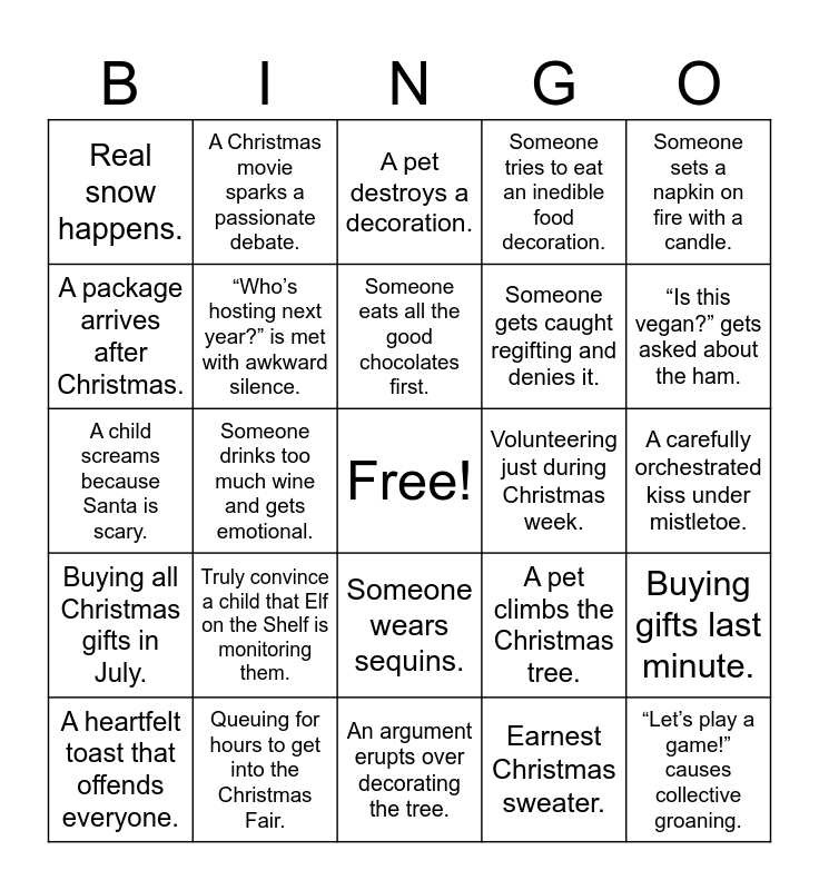 This bingo card has a free space and 75 words: A child opens someone else’s gift., Someone says, “It’s so commercialized now.”, A pet destroys a decoration., “Is this recyclable?” gets asked., Someone regifts a present you gave them., Grandma tells the same story as last year., Someone spills eggnog., Christmas lights don’t work., A guest arrives way too early., An argument about politics breaks out., Someone mentions their diet while eating cookies., A family photo goes horribly wrong., Someone eats all the good chocolates first., A package arrives after Christmas., A gift box has clearly been reused., Someone drinks too much wine and gets emotional., A gift has batteries not included., “Let’s play a game!” causes collective groaning., A pet is caught chewing the wrapping paper., Someone sets a napkin on fire with a candle., Someone trips on a tangled string of lights., A child screams because Santa is scary., “Who’s hosting next year?” is met with awkward silence., A Christmas movie sparks a passionate debate., Someone tries to eat an inedible food decoration., “Alexa, play Christmas music” has unexpected results., A pet steals food from the table., Someone opens a gift and goes, “Oh… how thoughtful!”, A Christmas playlist skips to Halloween music., Someone has a Christmas card from 2018 on display., Someone forgets to take the price tag off a gift., A child throws a tantrum over not getting what they wanted., Someone knocks over the tree trying to take a selfie., A pet climbs the Christmas tree., “Is this vegan?” gets asked about the ham., Someone gets caught regifting and denies it., Someone complains about holiday traffic., Someone mentions mistletoe is poisonous., A carefully orchestrated kiss under mistletoe., Earnest Christmas sweater., Christmas sweater with actual lights built in., Nobody wants to do Secret Santa., Somebody forgets a Secret Santa gift., Someone insists Die Hard is a Christmas movie., A Netflix Christmas movie in a made-up European country., A heartfelt toast that offends no one., A heartfelt toast that offends everyone., Real snow happens., Fake snow happens., Rock 'n' roll version of a Christmas song., A debate about “Do They Know It’s Christmas” erupts., Someone wears sequins., Someone wears velvet., Someone wears a Santa hat., Someone wears holiday socks., Festively dressed dog or cat., Doing the 12 pubs of Christmas., Someone says “Happy holidays.”, Christmas-themed bingo at a company party., Getting drunk at a company party., Truly convince a child that Elf on the Shelf is monitoring them., Forget where you hid the presents., A gift card as a present., A kid changes their mind about what they want for Christmas after it was already bought., Flying somewhere warm for Christmas., Volunteering just during Christmas week., Experimental addition to the Christmas dinner menu., A kitchen appliance breaks down., Not getting a present for someone who bought one for you., Buying gifts last minute., Buying all Christmas gifts in July., Queuing for hours to get into the Christmas Fair., Forgetting where you stored the decorations last year., An argument erupts over decorating the tree. and Creative tree positioning to hide its flaws..