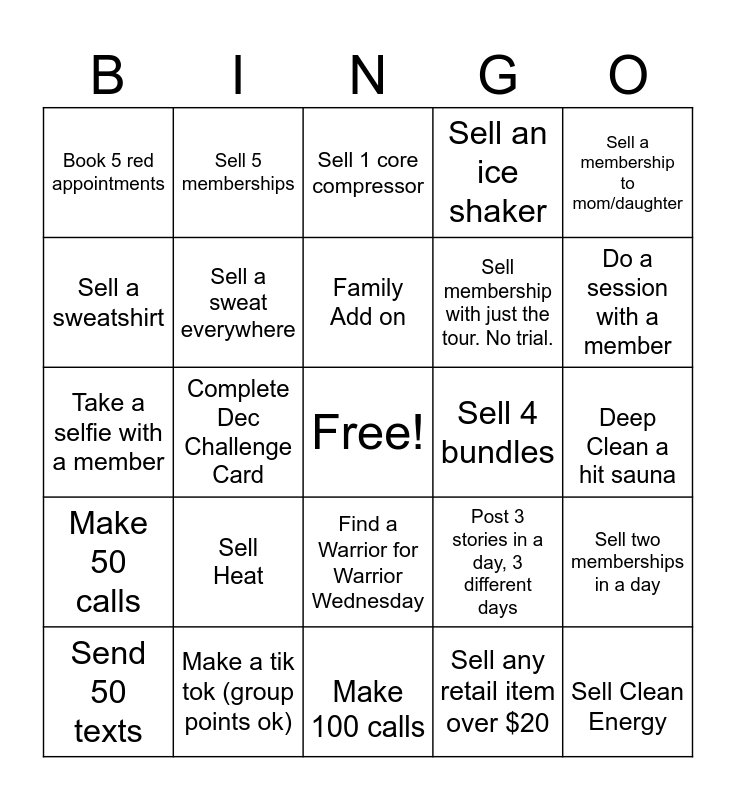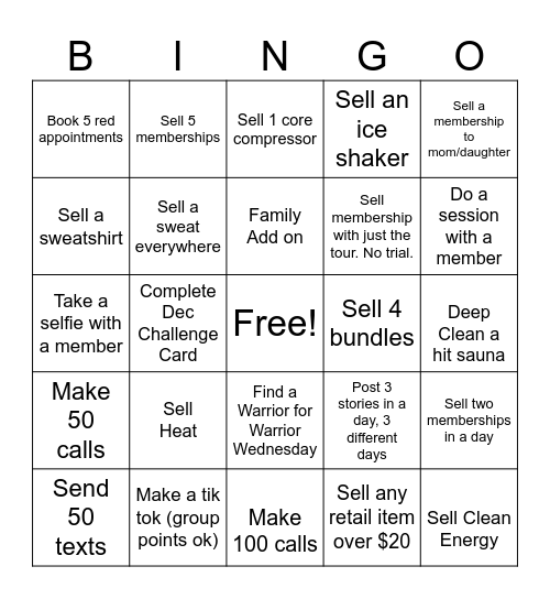 This bingo card has a free space and 24 words: Sell Heat, Make a tik tok (group points ok), Family Add on, Send 50 texts, Sell a membership to mom/daughter, Book 5 red appointments, Sell a sweatshirt, Sell 5 memberships, Sell 4 bundles, Find a Warrior for Warrior Wednesday, Sell membership with just the tour. No trial., Take a selfie with a member, Post 3 stories in a day, 3 different days, Sell two memberships in a day, Sell a sweat everywhere, Sell any retail item over $20, Deep Clean a hit sauna, Sell 1 core compressor, Do a session with a member, Complete Dec Challenge Card, Sell Clean Energy, Make 50 calls, Sell an ice shaker and Make 100 calls.