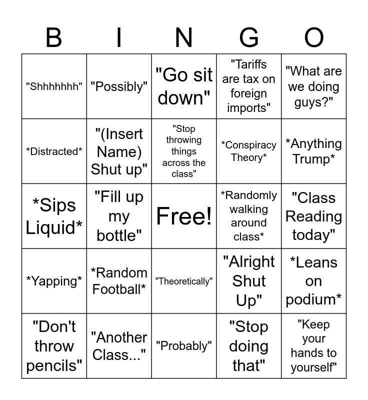 This bingo card has a free space and 24 words: *Random Football*, "Another Class...", "Stop throwing things across the class", "Don't throw pencils", "What are we doing guys?", "Shhhhhhh", *Distracted*, "Possibly", *Randomly walking around class*, "Theoretically", *Conspiracy Theory*, *Sips Liquid*, "Alright Shut Up", *Leans on podium*, "(Insert Name) Shut up", "Stop doing that", "Class Reading today", "Go sit down", *Anything Trump*, "Fill up my bottle", "Keep your hands to yourself", *Yapping*, "Tariffs are tax on foreign imports" and "Probably".