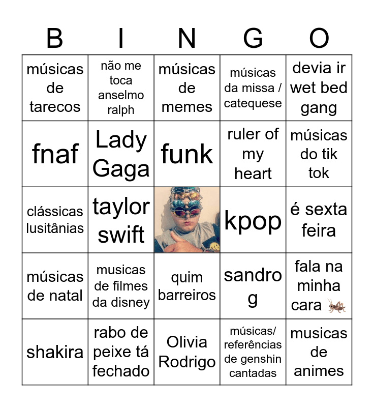 This bingo card has a free space and 24 words: shakira, musicas de filmes da disney, funk, músicas/ referências de genshin cantadas, devia ir wet bed gang, músicas de tarecos, não me toca anselmo ralph, músicas de memes, kpop, é sexta feira, clássicas lusitânias, Lady Gaga, sandro g, fala na minha cara 🦗, fnaf, rabo de peixe tá fechado, Olivia Rodrigo, músicas da missa / catequese, músicas do tik tok, músicas de natal, taylor swift, quim barreiros, ruler of my heart and musicas de animes.