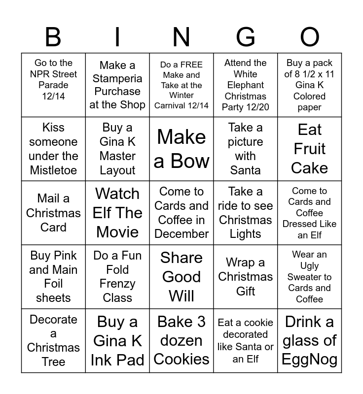 This bingo card has a free space and 29 words: Decorate a Christmas Tree, Find a Christmas Pickle, Watch Elf The Movie, Go the the NPR Boat Parade 12/7, Go to the NPR Street Parade 12/14, Do a FREE Make and Take at the Winter Carnival 12/14, Buy a Gina K Master Layout, Do a Fun Fold Frenzy Class, Take a ride to see Christmas Lights, Buy a Gina K Ink Pad, Come to Cards and Coffee Dressed Like an Elf, Drink a glass of EggNog, Bake 3 dozen Cookies, Eat a cookie decorated like Santa or an Elf, Eat Fruit Cake, Attend the Cookie Exchange 12/20, Share Good Will, Buy Pink and Main Foil sheets, Buy a pack of 8 1/2 x 11 Gina K Colored paper, Mail a Christmas Card, Wrap a Christmas Gift, Make Stocking stuffer and fill with candy, Take a picture with Santa, Kiss someone under the Mistletoe, Attend the White Elephant Christmas Party 12/20, Make a Stamperia Purchase at the Shop, Wear an Ugly Sweater to Cards and Coffee, Make a Bow and Make a Scrapy Boy Purchase at the Shop.