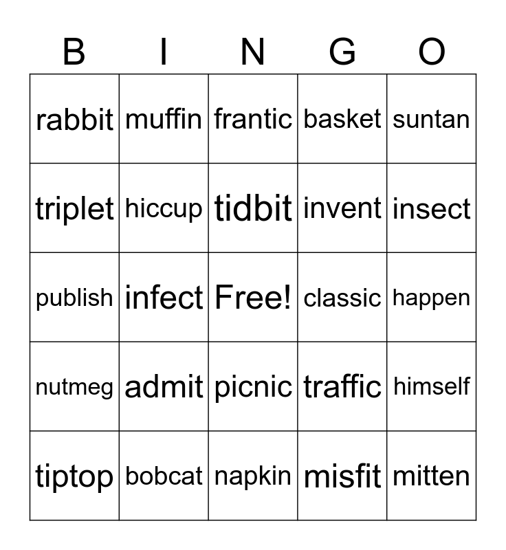 This bingo card has a free space and 24 words: admit, bobcat, tidbit, tiptop, suntan, rabbit, triplet, muffin, classic, picnic, invent, publish, traffic, himself, hiccup, misfit, happen, frantic, insect, infect, mitten, nutmeg, basket and napkin.