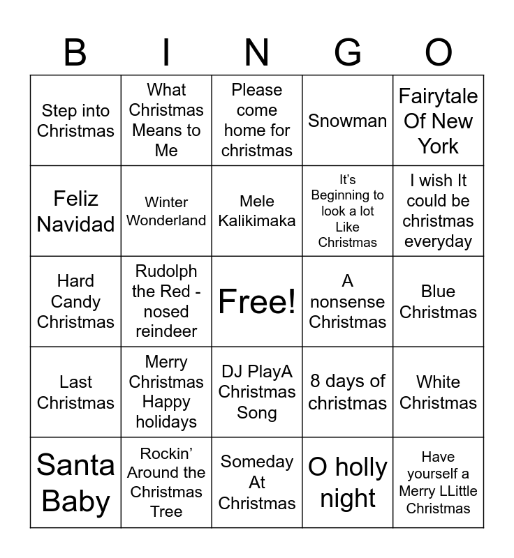 This bingo card has a free space and 62 words: All I Want for Christmas is You, Rockin’ Around the Christmas Tree, Jingle bell Rock, Last Christmas, Santa Tell Me, Underneath The Tree, Winter Wonderland, Holly Jolly Christmas, It’s Beginning to look a lot Like Christmas, Its the most wonderful Time of the year, Snowman, Run Rudolph Run, Feliz Navidad, The Christmas Song, Christmas Time is Here, Step into Christmas, Have yourself a Merry LLittle Christmas, Fairytale Of New York, Driving home for Christmas, Mele Kalikimaka, A nonsense Christmas, Please come home for christmas, Santa Baby, O holly night, Little Saint Nick, Mistletoe, You make it Feel like Christmas, Deck the Hall, White Christmas, Wonderful Christmastime, Santa Cant you hear me, Christmas Tree Farm, Santa Claus is Comin to town, Happy Xmas, Blue Christmas, What Christmas Means to Me, Merry Christmas, My only Wish, Rudolph the Red - nosed reindeer, Thank God its Christmas, Hard Candy Christmas, Baby it’s Cold outside, Merry Christmas Happy holidays, I Saw Mommy Kissing Santa clause, I wish It could be christmas everyday, 8 days of christmas, jingle bells, one more sleep, Like its christmas, We wish you the merriest, DJ PlayA Christmas Song, Someday At Christmas, Christmas In Hollis, Frosty the Snowman, Man With the Bag, Santas Coming for us, Sleigh ride, Merry Christmas Everyone, You’re a mean one Mr.grinch, this Christmas, Here comes Santa Clause and Cozy Little Christmas.
