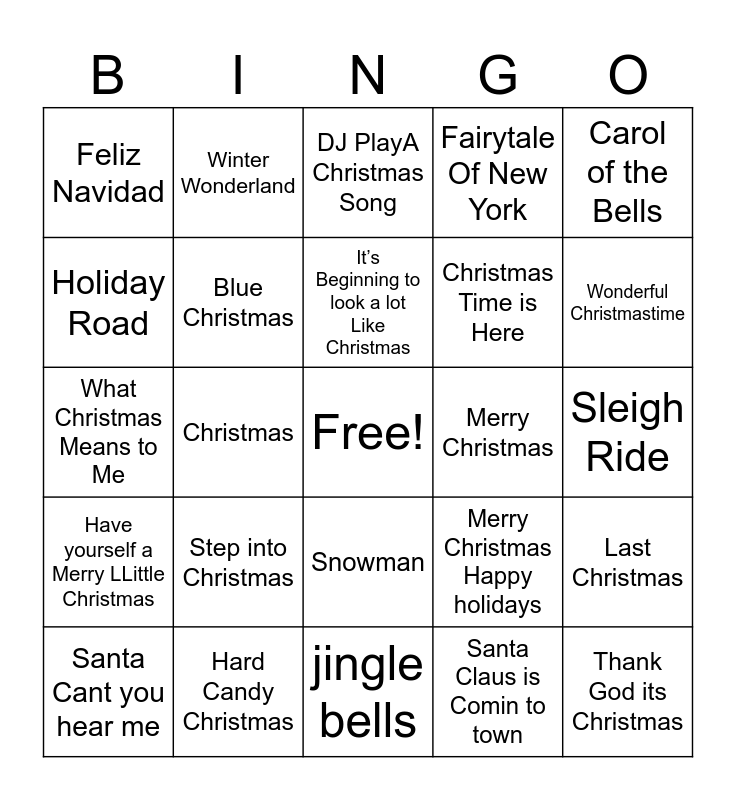 This bingo card has a free space and 63 words: All I Want for Christmas is You, Rockin’ Around the Christmas Tree, Jingle bell Rock, Last Christmas, Santa Tell Me, Underneath The Tree, Winter Wonderland, Holly Jolly Christmas, It’s Beginning to look a lot Like Christmas, Its the most wonderful Time of the year, Snowman, Run Rudolph Run, Sleigh Ride, Carol of the Bells, Let It Snow! Let It Snow! Let It Snow!, Holiday Road, Christmas, Feliz Navidad, The Christmas Song, Christmas Time is Here, Step into Christmas, Have yourself a Merry LLittle Christmas, Fairytale Of New York, Driving home for Christmas, Mele Kalikimaka, A nonsense Christmas, Please come home for christmas, Santa Baby, O holly night, Little Saint Nick, Mistletoe, You make it Feel like Christmas, Deck the Hall, White Christmas, Wonderful Christmastime, Santa Cant you hear me, Christmas Tree Farm, Santa Claus is Comin to town, Happy Xmas, Blue Christmas, What Christmas Means to Me, Merry Christmas, My only Wish, Rudolph the Red - nosed reindeer, Thank God its Christmas, Hard Candy Christmas, Baby it’s Cold outside, Merry Christmas Happy holidays, I Saw Mommy Kissing Santa clause, I wish It could be christmas everyday, 8 days of christmas, jingle bells, one more sleep, Like its christmas, We wish you the merriest, DJ PlayA Christmas Song, Someday At Christmas, Christmas In Hollis, Frosty the Snowman, Man With the Bag, Santas Coming for us, Sleigh ride and Merry Christmas Everyone.