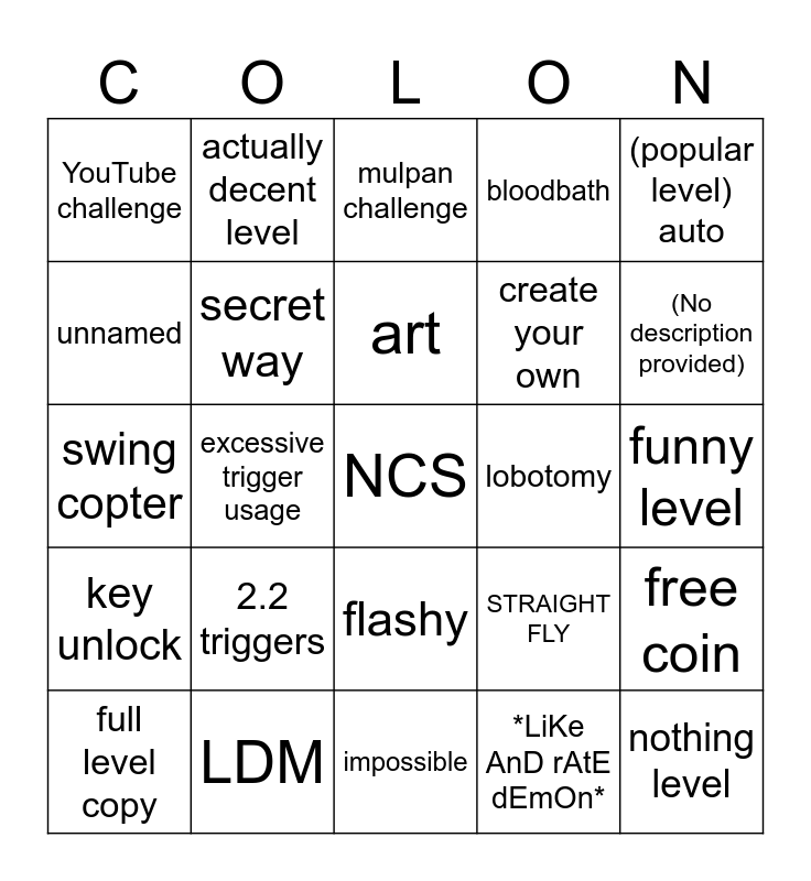 This bingo card has 25 words: 2.2 triggers, impossible, art, full level copy, (popular level) auto, YouTube challenge, unnamed, actually decent level, lobotomy, flashy, create your own, swing copter, STRAIGHT FLY, free coin, secret way, nothing level, funny level, mulpan challenge, (No description provided), excessive trigger usage, NCS, LDM, key unlock, bloodbath and *LiKe AnD rAtE dEmOn*.