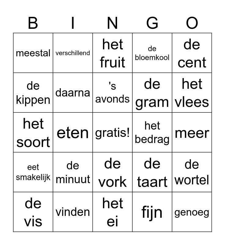This bingo card has a free space and 54 words: allemaal, eet smakelijk, het glas, het ijs, de vork, altijd, de bloemkool, de kaas, de kippen, lekker, meestal, nooit, vinden, de vis, dom, het ei, genoeg, de gram, koud, meer, de taart, de oven, het bedrag, de cent, gebruiken, verschillend, alstublieft, de druif, de helft, fijn, de kilo, de komkommer, terug, de bananen, het fruit, de sinaasappel, het soort, de wortel, de zakken, daarna, goedkoop, in de aanbieding, de kassa, want, de minuut, de pan, het zout, het ontbijt, 's avonds, eten, het vlees, het brood, boodschappen doen and de appels.