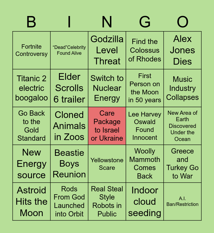 This bingo card has a free space and 24 words: Beastie Boys Reunion, Rods From God Launched into Orbit, Switch to Nuclear Energy, Astroid Hits the Moon, Alex Jones Dies, Fortnite Controversy, Titanic 2 electric boogaloo, “Dead”Celebrity Found Alive, Lee Harvey Oswald Found Innocent, Yellowstone Scare, First Person on the Moon in 50 years, Go Back to the Gold Standard, Woolly Mammoth Comes Back, Greece and Turkey Go to War, Elder Scrolls 6 trailer, Indoor cloud seeding, New Area of Earth Discovered Under the Ocean, Godzilla Level Threat, Music Industry Collapses, Cloned Animals in Zoos, A.I. Ban/Restriction, New Energy source, Find the Colossus of Rhodes and Real Steal Style Robots in Public.