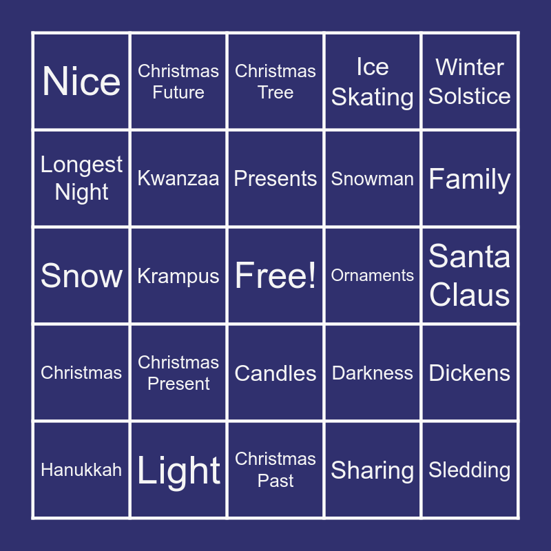 This bingo card has a free space and 33 words: Scrooge, Ghost, Krampus, Memories, Christmas, Kwanzaa, Winter Solstice, Hanukkah, Christmas Future, Traditions, Presents, Christmas Tree, Witches, Home, Ornaments, Family, Light, Snow, Christmas Present, Darkness, Candles, Naughty, Nice, Santa Claus, Christmas Past, Sledding, Ice Skating, Snowman, Longest Night, Dickens, Festival, Sharing and Kindness.
