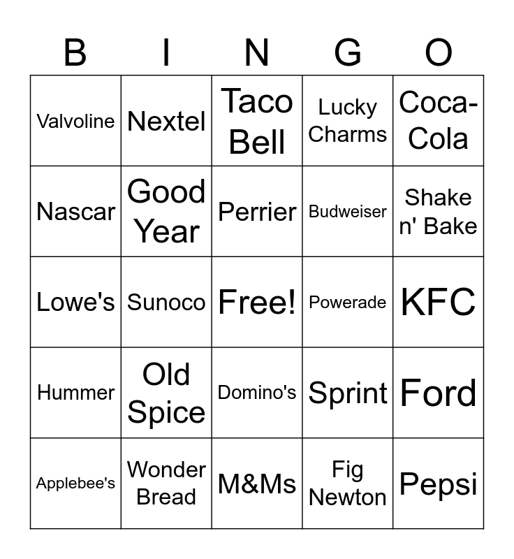 This bingo card has a free space and 24 words: Old Spice, Wonder Bread, Perrier, Applebee's, Coca-Cola, Valvoline, Nascar, Nextel, Powerade, Domino's, Budweiser, Lowe's, Sprint, Ford, Good Year, Fig Newton, KFC, Taco Bell, Shake n' Bake, Sunoco, Pepsi, Hummer, Lucky Charms and M&Ms.