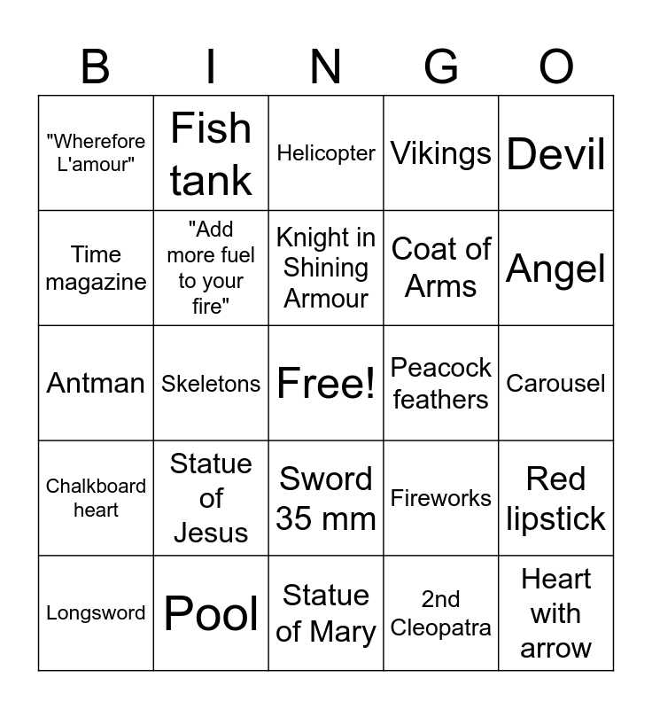 This bingo card has a free space and 24 words: Statue of Jesus, Pool, Knight in Shining Armour, Longsword, Devil, "Wherefore L'amour", Time magazine, Fish tank, Peacock feathers, Sword 35 mm, Coat of Arms, Antman, Fireworks, Red lipstick, "Add more fuel to your fire", 2nd Cleopatra, Carousel, Helicopter, Angel, Skeletons, Heart with arrow, Chalkboard heart, Vikings and Statue of Mary.