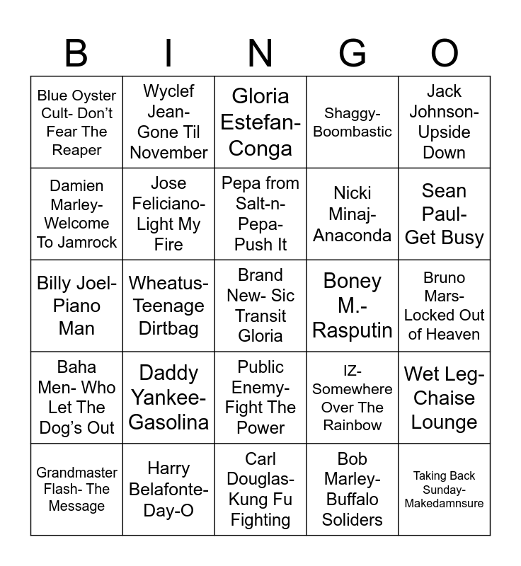 This bingo card has 28 words: Wet Leg- Chaise Lounge, Rihanna- Don’t Stop The Music, Nicki Minaj- Anaconda, Bob Marley- Buffalo Soliders, Damien Marley- Welcome To Jamrock, Gloria Estefan- Conga, Wyclef Jean- Gone Til November, Baha Men- Who Let The Dog’s Out, Boney M.- Rasputin, Grandmaster Flash- The Message, Billy Joel- Piano Man, Shaggy- Boombastic, Harry Belafonte- Day-O, Carl Douglas- Kung Fu Fighting, Sean Paul- Get Busy, Ricky Martin- Livin’ La Vida Loca, Daddy Yankee- Gasolina, Jose Feliciano- Light My Fire, Pepa from Salt-n-Pepa- Push It, Public Enemy- Fight The Power, Blue Oyster Cult- Don’t Fear The Reaper, Taking Back Sunday- Makedamnsure, Brand New- Sic Transit Gloria, Wheatus- Teenage Dirtbag, Bruno Mars- Locked Out of Heaven, IZ- Somewhere Over The Rainbow, Jack Johnson- Upside Down and Bette Midler- Wind Beneath My Wings.